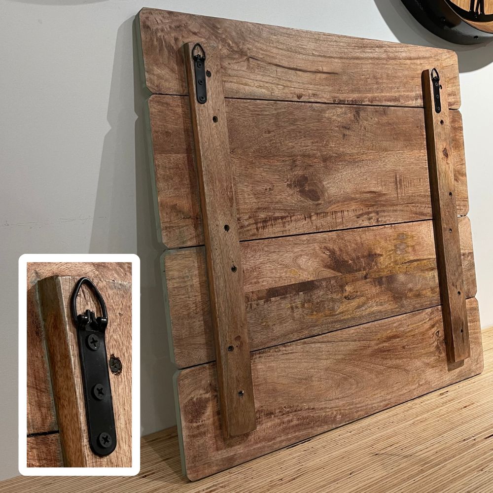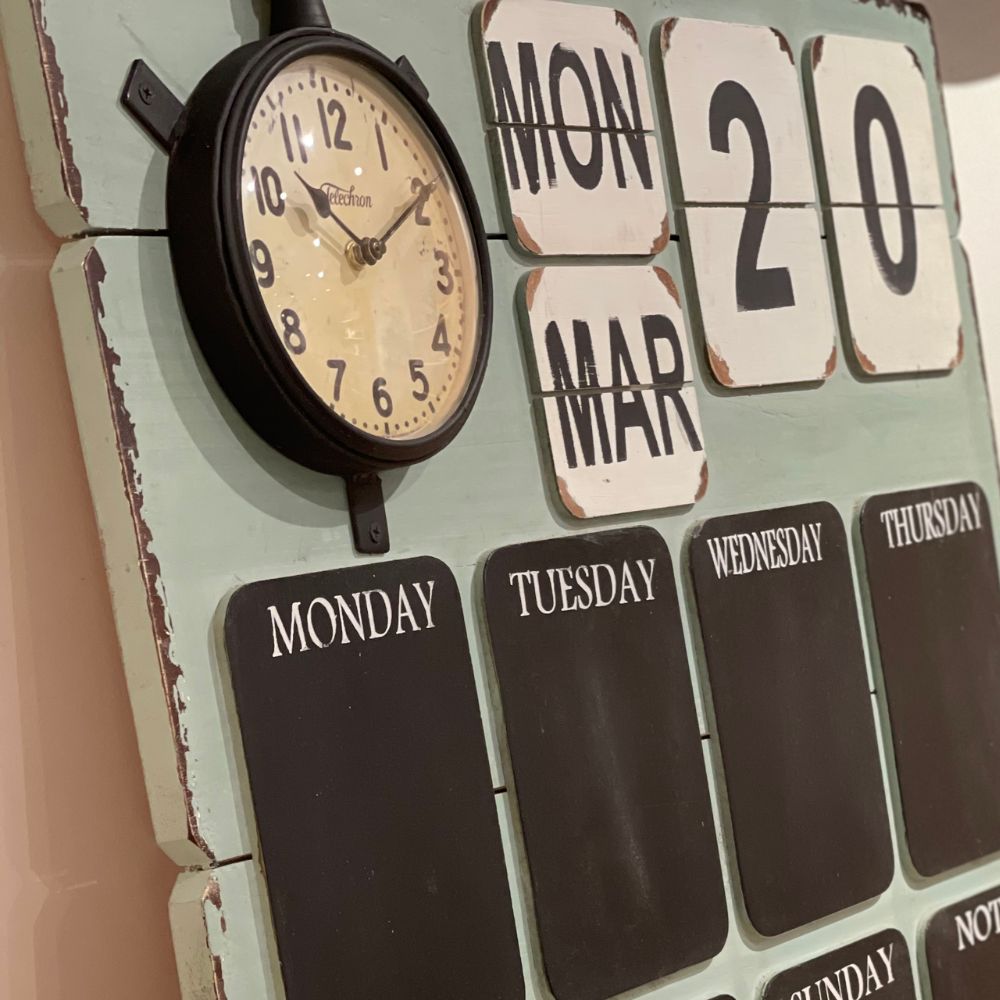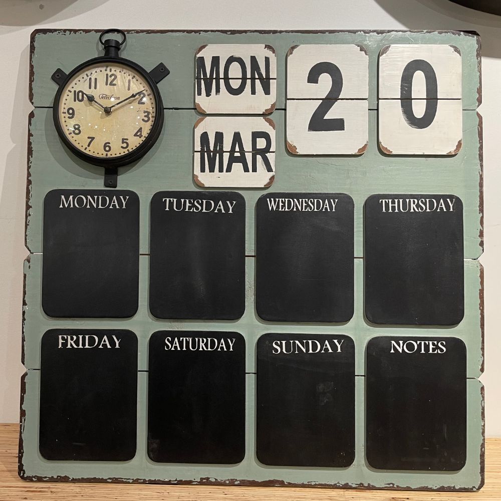 Rustic wooden organiser board with blackboard days of the week for writing notes in chalk (not included), and a working clock that operates with batteries.